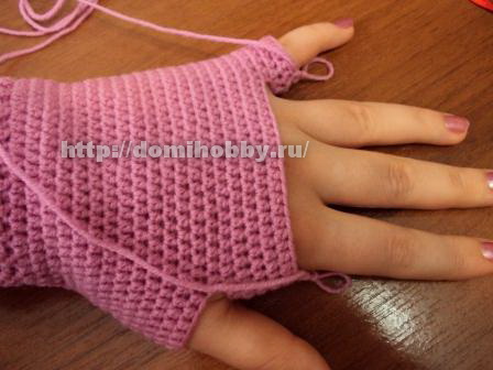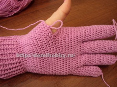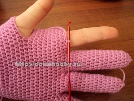 Перед началом вывязывания пальцев перчатки рассчитайте петли для каждого пальца. Можно определить их, примерив перчатку и заметив петли на внутренней и внешней стороне. Для вывязывания мизинца присоедините нить со стороны ладони, сделайте 3-4 возд. петли и присоедините арочку к тыльной стороне перчатки. Далее вяжите по кругу полустолбики на высоту мизинца.