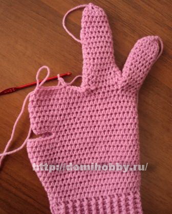 Далее мы вяжем точно так же еще четыре пальца: средний, безымянный, мизинец и большой.