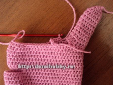 Начинаем вязать большой палец. Для этого мы должны закрепить нить за столбик, расположенный рядом с местом где мы оставляли, затем вяжем 3 возд. петли. Продолжаем вязать по схеме одну часть, а потом вторую. Обе стороны обвязываем столб. без накида.