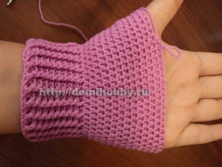 Провязав указательный палец, завершаем работу. Оформляем ее с помощью столбика без накида. Верхняя часть перчатки готова.