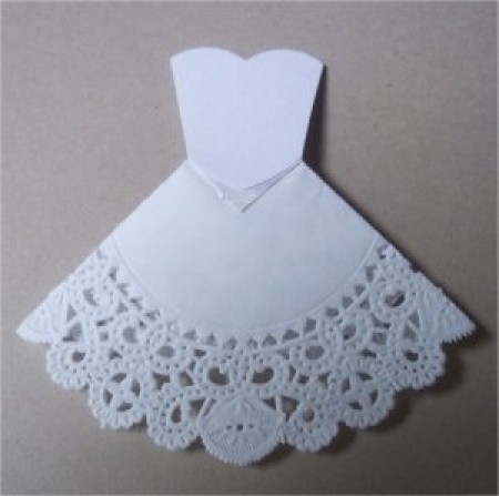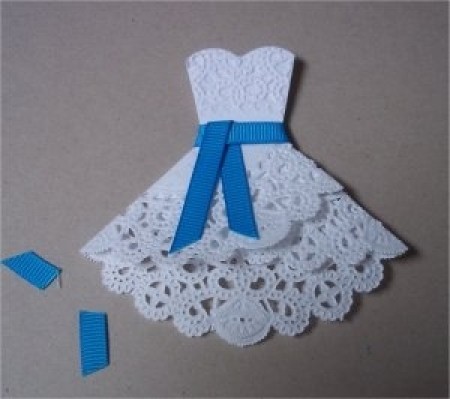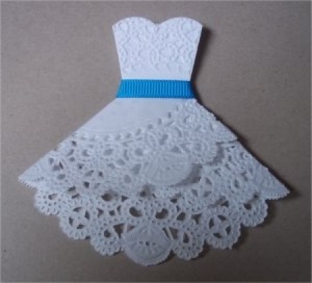 Такое платье, выполненное из салфеток, может стать украшением открытки или для сервировки стола. Сделать эту поделку из ажурных бумажных салфеток не составит особого труда. Главное — следовать пошаговым фотографиям данного мастер-класса.