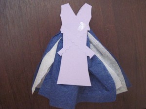 Из цветной бумажной салфетки сделайте юбку платья. Расправьте салфетку и сложите таким образом, чтобы показывался краешек на два – три сантиметра. Теперь присоберите на талии в резиночку. Затем красиво расправьте складки на подоле и зафиксируйте на картонной основе.