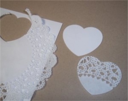 Из бумаги белого цвета и ажурной части второй салфетки вырежьте сердечко одинакового размера.