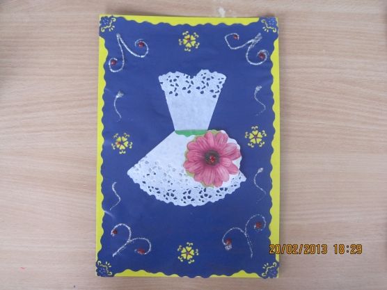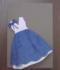 После чего украшаем платье небольшим бантиком и приклеиваем его на будущую открытку. Такой нежнейший вариант прекрасно подойдет в качестве праздничной открытки для девочек или мамы.