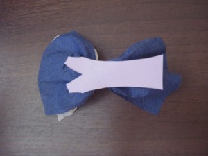 Находим центр двух салфеток и собираем их по форме подобной бантику. Закрепляем изделие скотчем таким образом, чтобы края (скотча) оказались с изнаночной стороны верхней части платья.