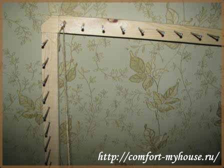 Далее, воспользовавшись молотком, необходимо вбить гвозди. Нужно отступить от угла 8 см., начать вбивать через каждые 4 см. по 33 гвоздя на каждой стороне. Рама готова.