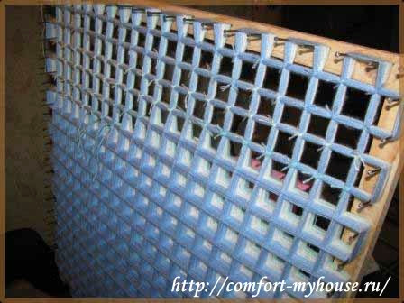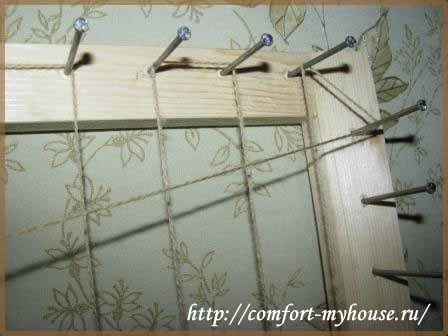 Сначала берут пряжу для основы изделия и натягивают ее так, чтобы в каждом ряду получилось по 20 ниточек, а в местах пересечения по 40. Привязывают первую нитку к верхнему левому гвоздю на раме.
