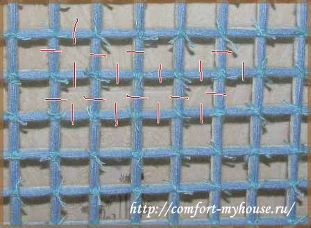 Завязывать узлы на пересечениях, не пропуская ни одного пересечения, иначе плед не получится