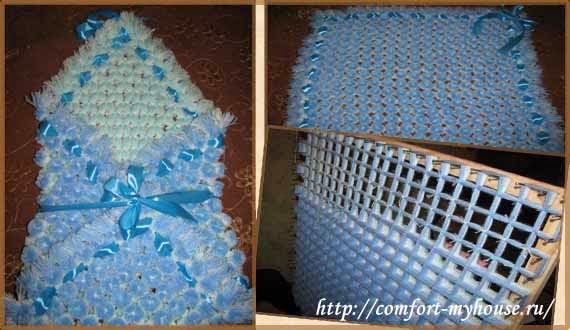 Плетение происходит аналогично с вышеописанной техникой, разница только в размерах рамы и количестве пряжи. В зависимости от ее качества для новорожденного 80 см на 100 см уйдет от 9-10 мотков по 100м.