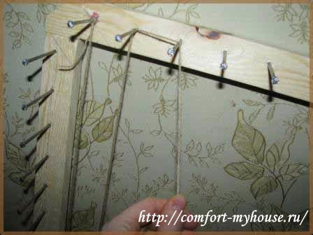 Когда рама готова, нужно вбить в неё гвозди на одинаковом расстоянии друг от друга. У меня расстояние 4 сантиметра. Можно делать 3 или 5 сантиметров на ваше усмотрение. Гвозди у меня — семидесятка, самый оптимальный вариант. Вбивал тоже муж .