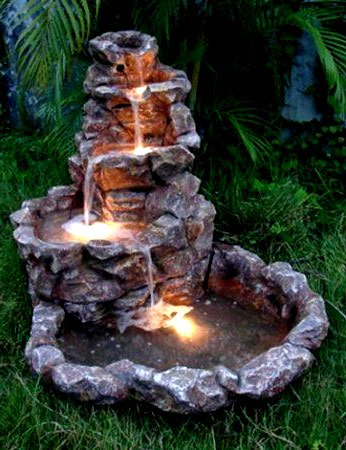 Фонтан декоративный с подсветкой, даже самой простой и невзрачной конструкции, может превратиться в необыкновенной красоты зрелище, если грамотно и толково расположить разноцветные осветители.