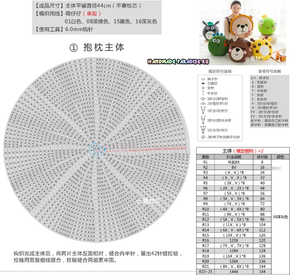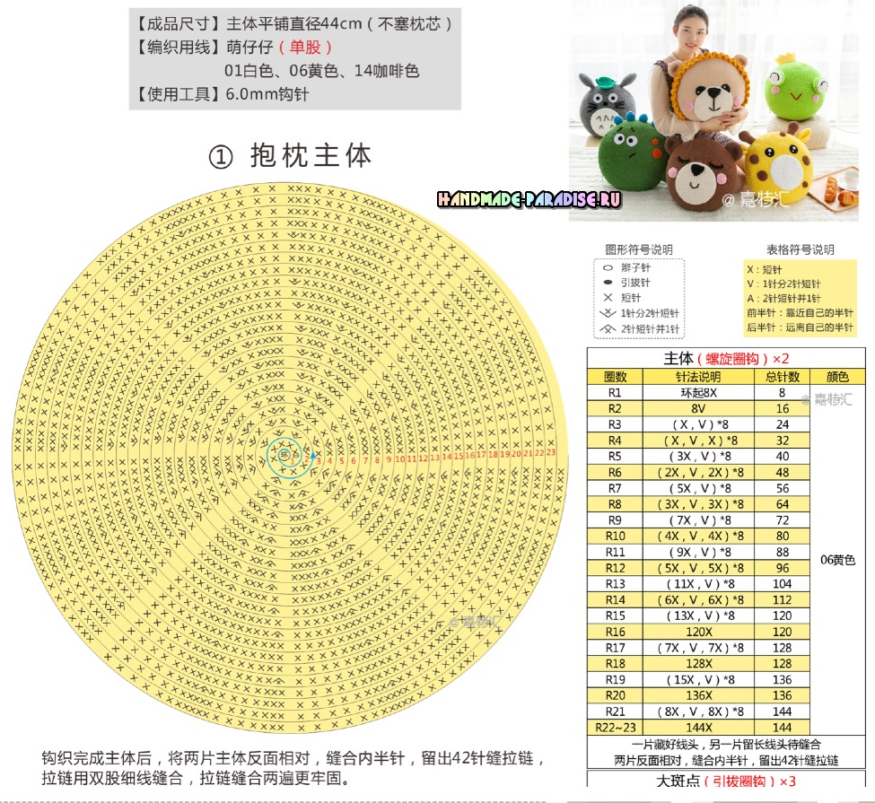 Начинаем вязание игрушки с выполнения своими руками кольца амигуруми. Провязываем в него крючком 6п. Схема работы далее: