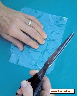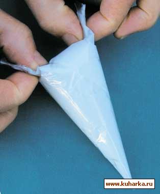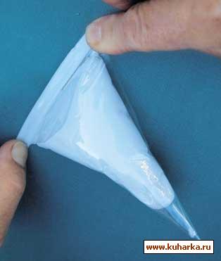 Для того, чтобы изготовить корнетик для глазури автор настаивает на использовании только настоящего целлофана. Возможно в этом есть смысл, хотя. возможно, что смысл заключается именно в том, чтобы искать свои собственные варианты… Мой собственный вариант — сделать такой «шприц-тюбик» из плотного полиэтилена и обклеить скотчем, который придаст носику необходимую жесткость.