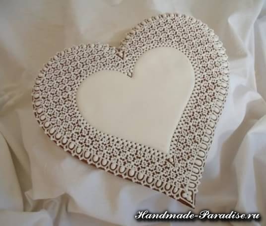 Для изготовления пряника для поздравления с 14 Февраля вырезаем из готового коржа заготовку в виде сердца. Трафаретом меньшего размера намечается контур, по которому пойдет обводка глазурью белого цвета. Далее по контуру рисуется узор из половинок окружностей. Оставляют пряник на некоторое время для просушки.