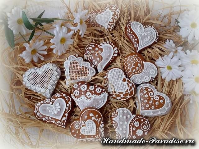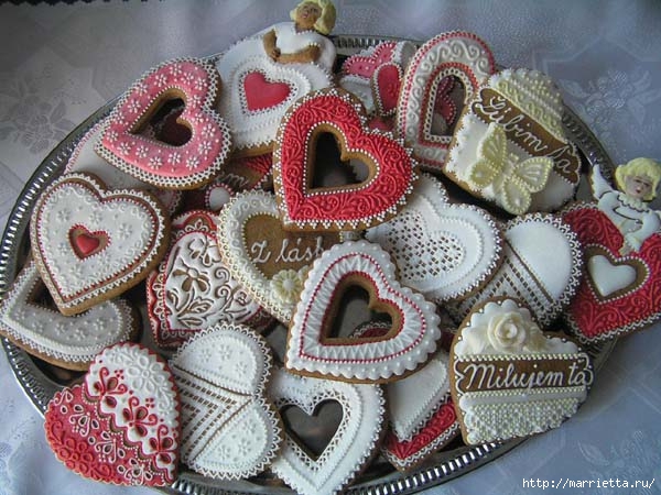 Пряники в форме сердца ко дню Святого Валентина. Пряники могут быть самыми разнообразными: в форме валентинок, яйца, кулича, зайца и так далее. К созданию таких пряничков можно привлечь детей — для них это будет интересное и развивающее занятие.