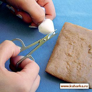 Сделать глазурь. Смешать яичный белок, сахарную пудру и лимонный сок. Пудру добавлять постепенно, пока глазурь не станет по консистенции как сметана.