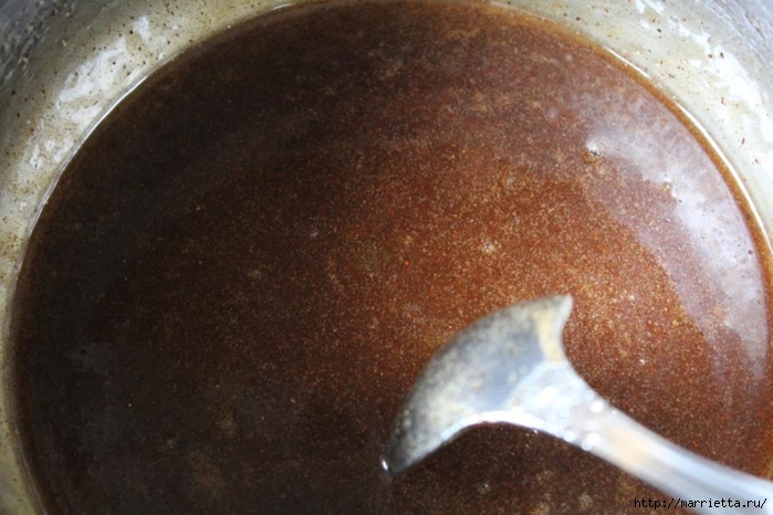 На небольшом огне растопить масло, мед и сахар. Добавить специи и остудить до комнатной температуры. В отдельной миске тщательно взбить яйца и добавить в остывший пряный сироп.