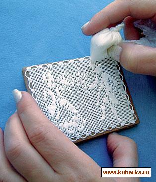 Глазурью белого цвета заливается фон пряника. Эту процедуру надо делать с большой осторожностью, чтобы глазурь не растекалась за пределы контура.