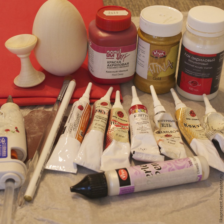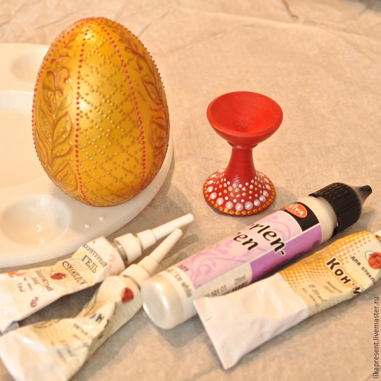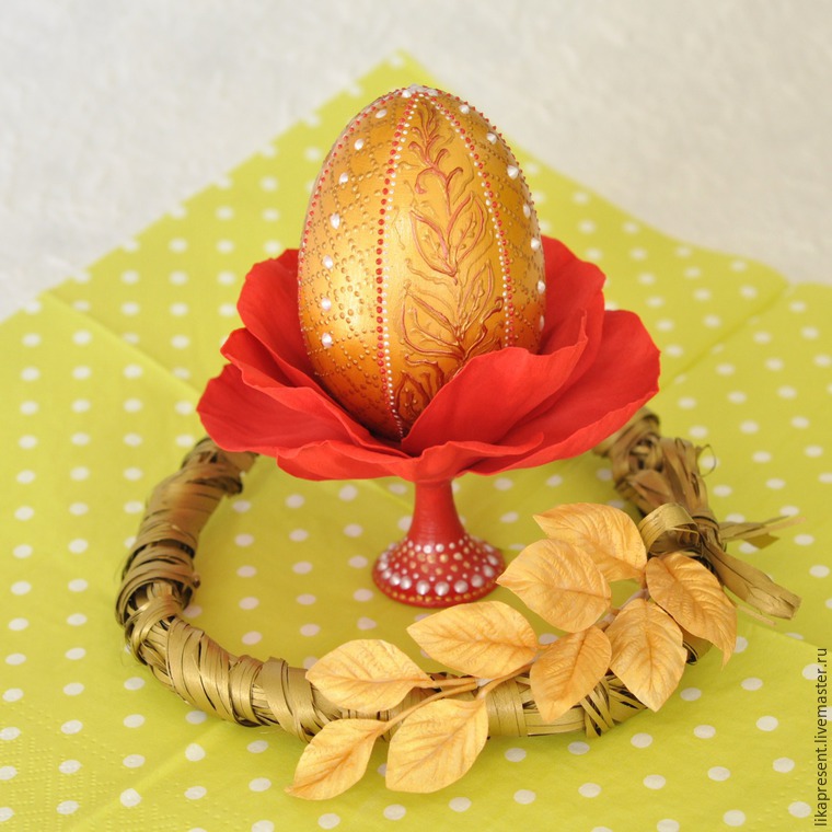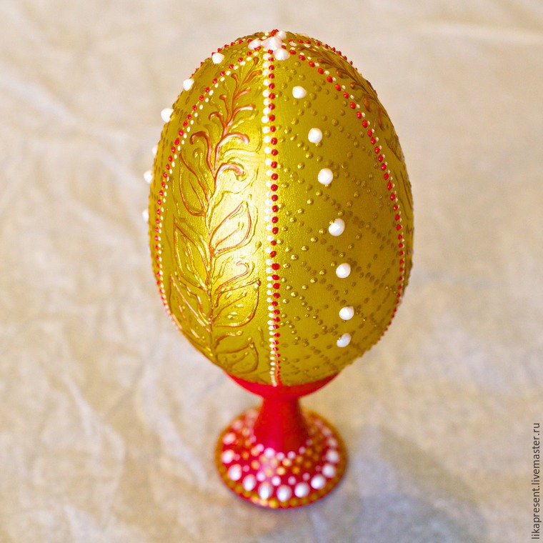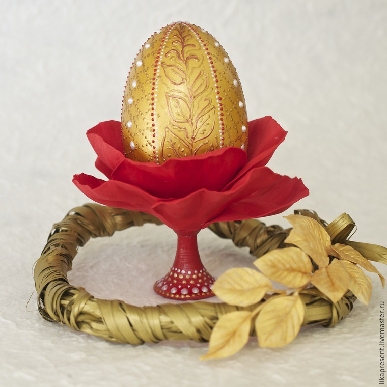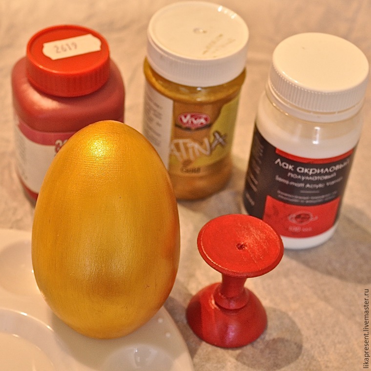Яйцо покрываем золотой краской. Подставку покрываем красной краской. Покрываем в 2-3 слоя. Просушиваем и сверху покрываем лаком. Вот что получилось.