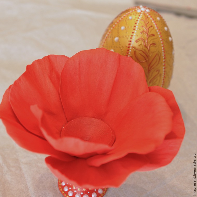 Для мастер-класса я выбрала два основных цвета — золотой и красный. Красный цвет с библейских времен символизирут Пасху. Но мне хотелось именно лепестки сделать в красном цвете, поэтому чтобы добавить праздничность был выбран золотой цвет.