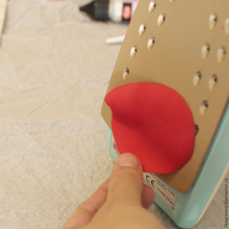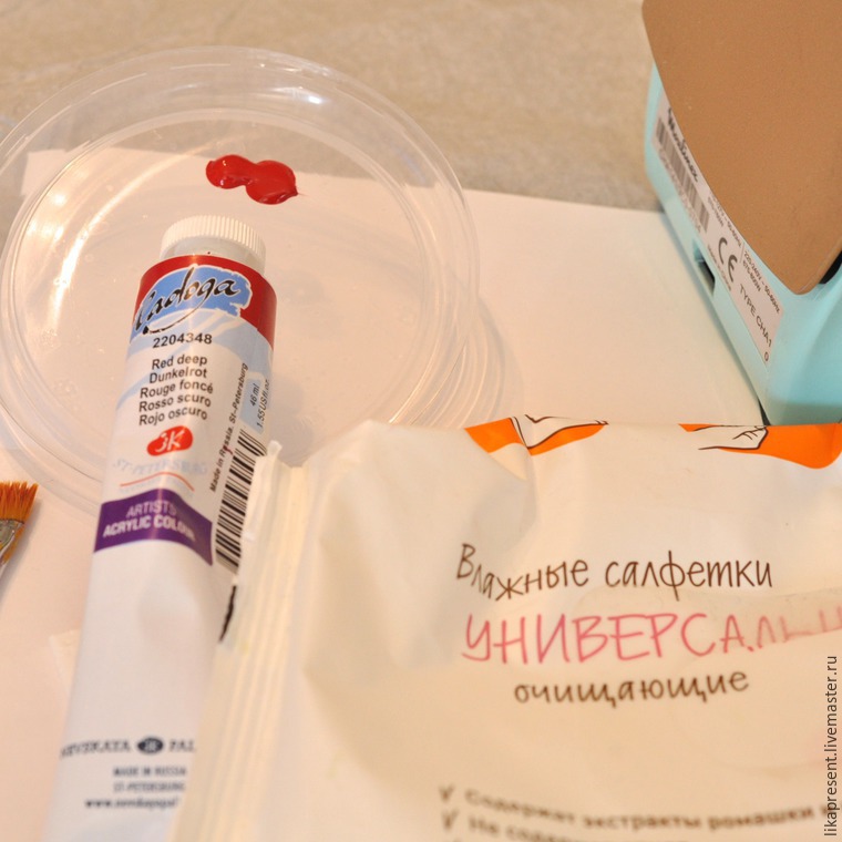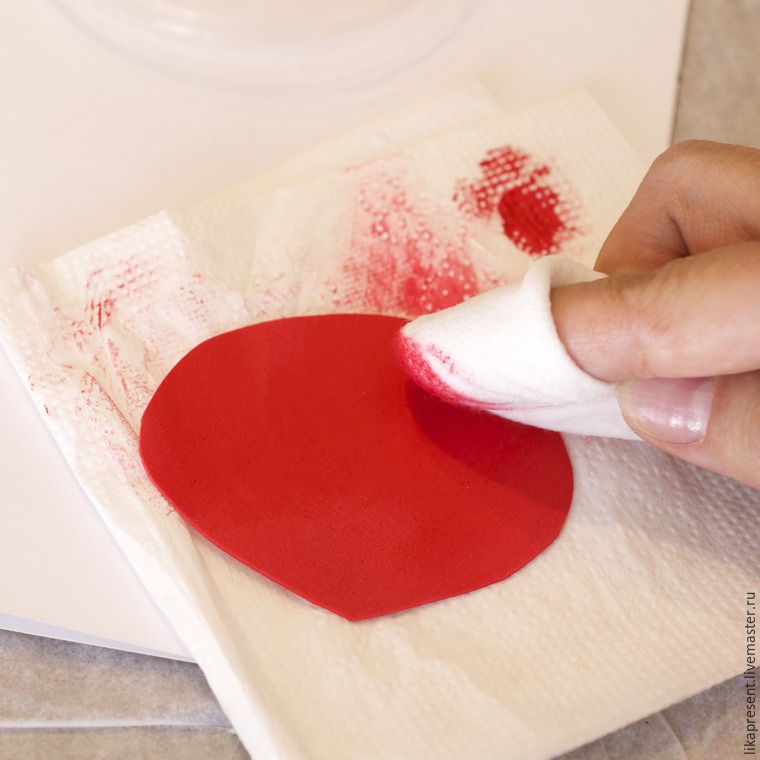 2) При желании лепестки можно тонировать акриловой темно-красной краской. Влажную салфетку наматываем на палец и окунаем в краску. По лепесткам проводим салфеткой с краской. Тонировать можно с обеих сторон.
