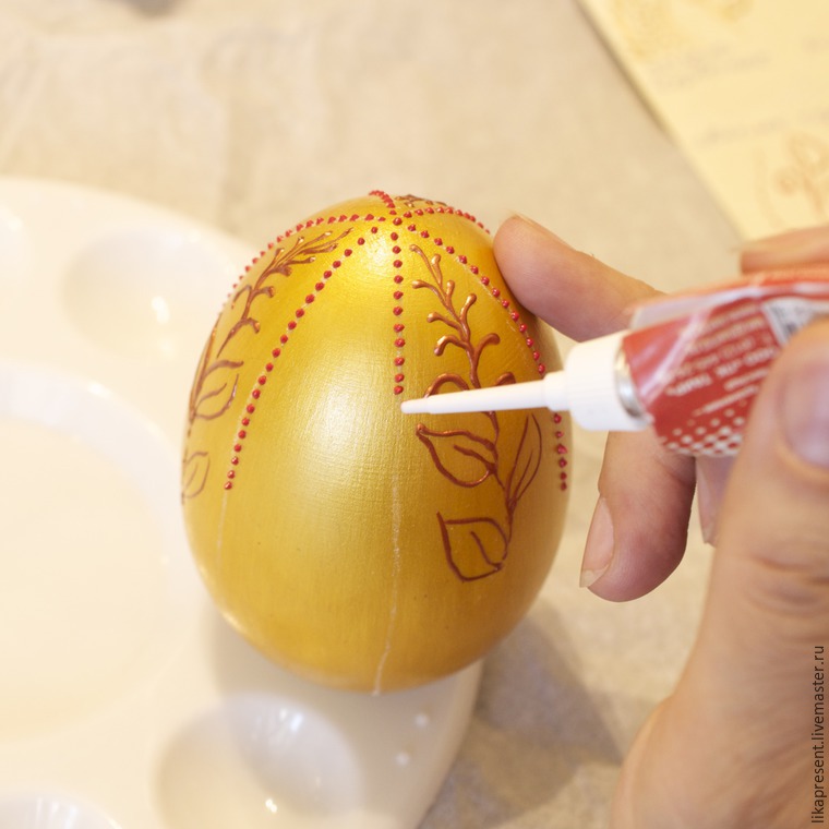 5) По разметке ставлю точки красным темным контуром. Работаю пока только с верхней частью расписываемого яйца, поэтому всё делаю пока до середины.