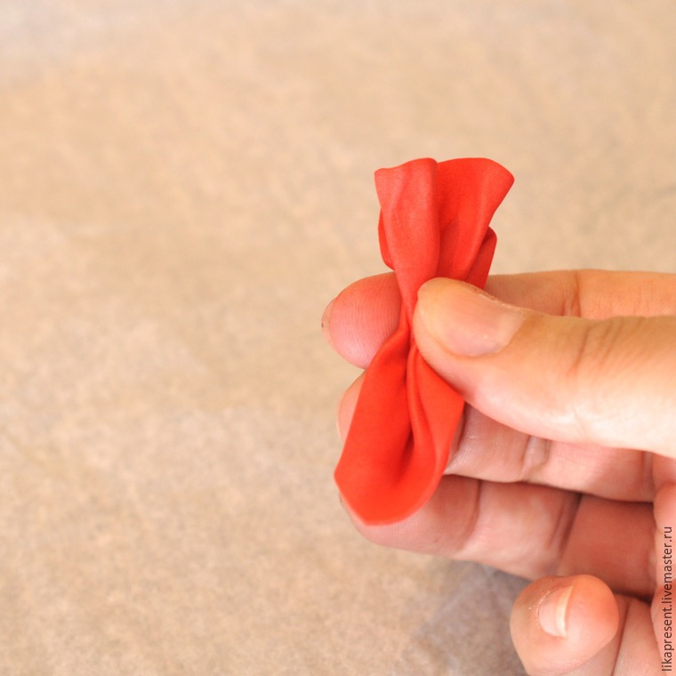 3) Обрабатываем лепестки на утюге. Прикладываем фоамиран к утюгу, когда он начнет подгибаться, лепесток складываем гармошкой и перетираем между пальцами пока лепестки немного не истончатся. Повторяем так со всеми лепестками.