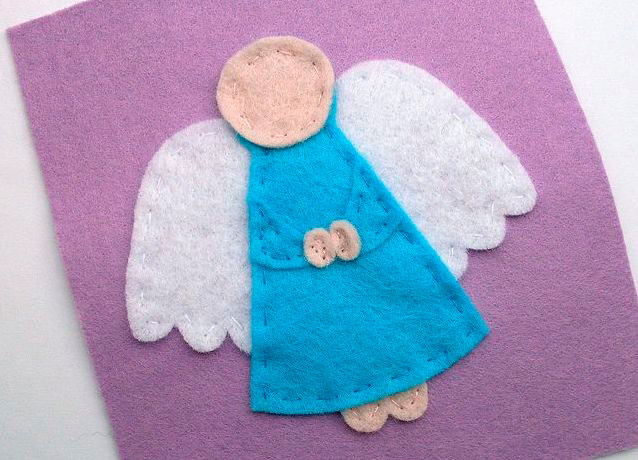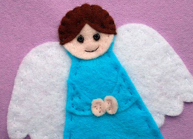 А совсем по-домашнему, очень трогательно выглядят ангелочки из мягкого сукна, с волосиками из холофайбера или пряжи для валяния. Главные украшения таких фигурок – золотистые атласные крылья и венок из золотой тесьмы.