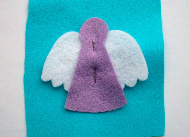 Крылья — вырезаем фетровые сердечки, обшиваем их нитками и приклеиваем узкую ленту в виде петельки между ними.