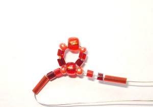 Затем мы нанизываем бисеринки, так как показано на фото и проведем рабочую «нить» через первую бусину. Добавив недостающие бисеринки, мы протянем проволоку через бусину на основе: