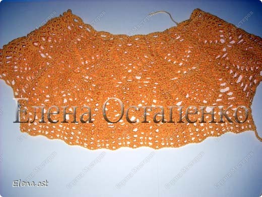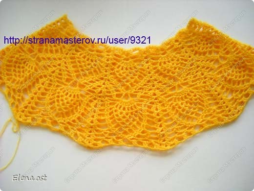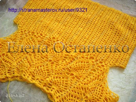 Вязание крючком продолжаем поворотными рядами по кругу узором из ракушек, описание которых приводилось выше. Участки для пройм также включаются в ажурный узор. Когда летний топик достигнет нужной длины, нить обрываем и прячем ее конец.
