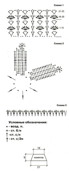 Вязать согласно схемам круговыми и прямыми рядами, при этом начинать каждый круг./ прямой ряд с указанного числа возд. п. на схеме и заканчивать соед. столбиком.