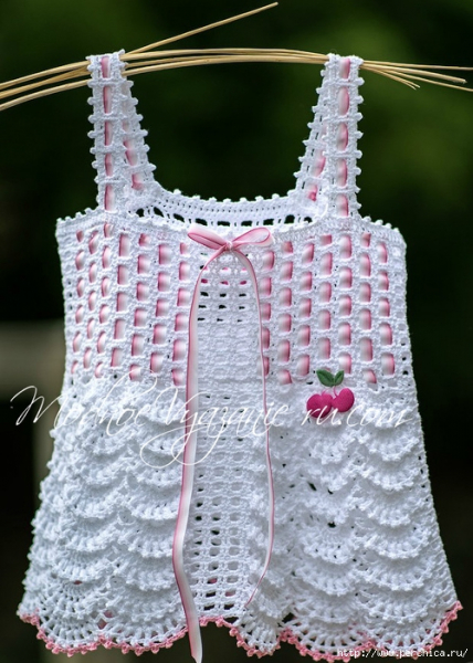 Времени на работу может потребоваться много. Но результат того стоит! Техника выполнения простая, цвета можно взять разные (белый, голубой, бежевый, зелёный или красный). Особенно хорошо, что изделие вяжется одним полотном и собирать ничего не нужно. Далее можно нашить большие бусины или крупные стразы на готовую вещь, чтобы сделать ее более нарядной. Так же, она отлично подойдет для беременных дам, только нужно будет немного изменить размер выкройки.