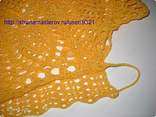 После выполнения ростка приступаем к основному телу изделия, используя описание. Закончив вязание последнего рядка, выполняем крючком цепочку из 20 воздушных петель для оформления проймы, соединив ею спинку и перед майки. Далее делаем ряд узора передней части и еще одну цепочку из 20 воздушных петель. Ее соединяем в круговой ряд на спинке.