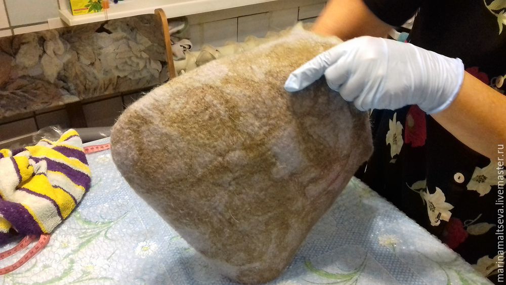 - Разглаживаем все валяное изделие, особенно торцы, которым мы уделяли мало внимания. Также поступим с верхом сумочки – не тянем, а именно прихлопываем, давим на края. Внутри тоже нужно поработать руками или массажером, чтобы плотность была ровной.
