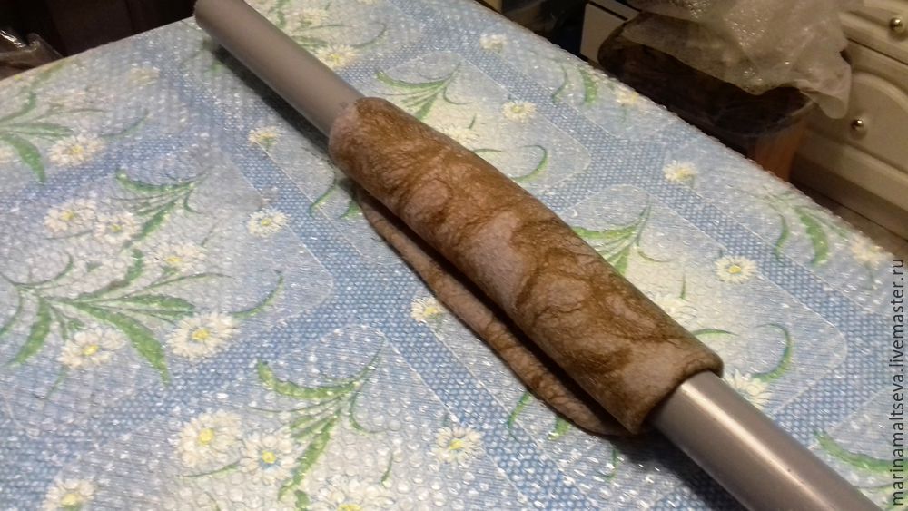 Труба у меня самая сантехническая, что продаётся в любом магазине для строительства и не только. Диаметр 5 см, самый ходовой для валяния. Заворачиваю трубу, как показано на снимке.