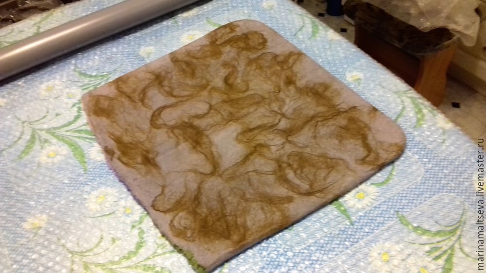 Вначале выкладывается кардочес, затем смачивается, немного притирается и шаблон переворачивается. Краешки загибаются и процесс выкладки шерсти продолжается. После кардочеса приходит черед мериноса, который укладывается вдоль и поперек шаблона. После этого можно накладывать декор.