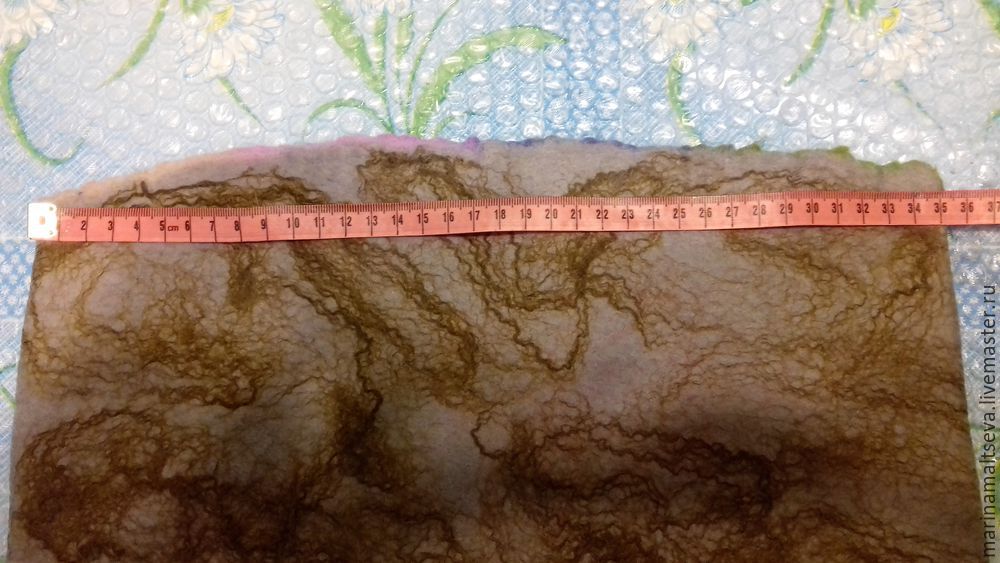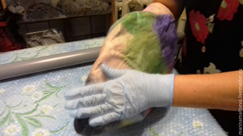 Валять заготовку нужно около двадцати минут, затем перевернуть шерсть вместе с шаблоном, подворачивая краешки.