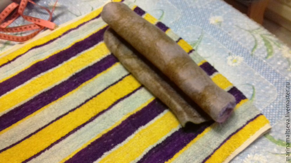 После того как нити шерсти сцепились, заготовка скручивается в валик и катается еще около десяти раз, делая в каждом подходе примерно 50 подкатов.