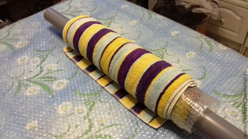 - Далее будущая сумка кладется на полотенце, с ним скручивается и катается по пленке с пупырышками;