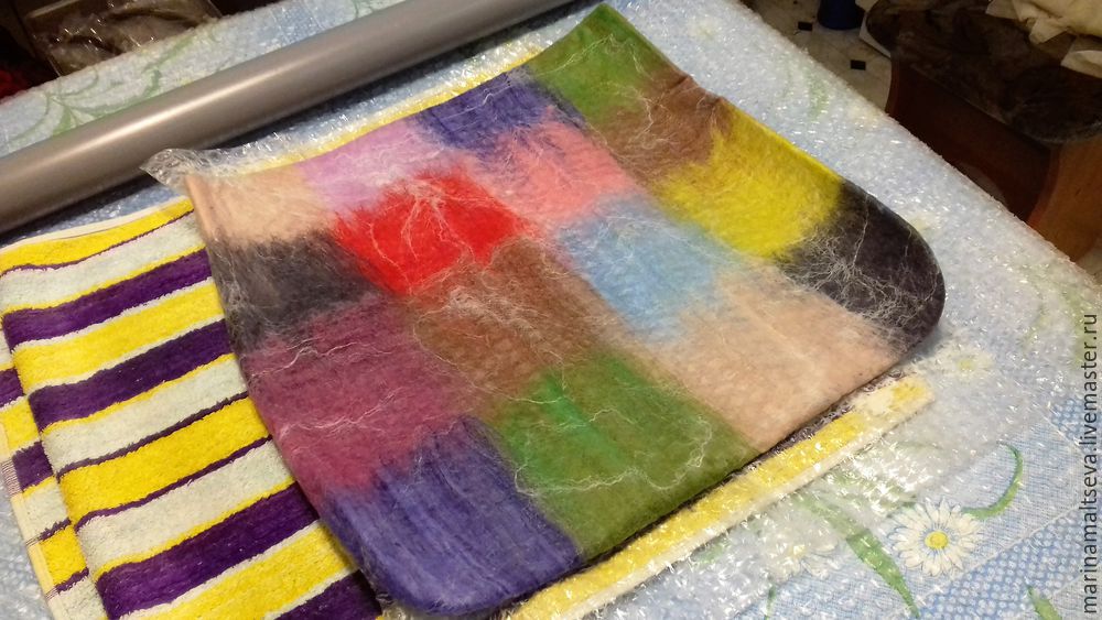 Пропитываем мылом материал (мокрый процесс валяния).- Накроем сверху сеточкой или слоем пленки-пупырки и придавим крепко пару раз, стараясь не сдвинуть слои. Можно немножко потереть или пробежаться скалкой.