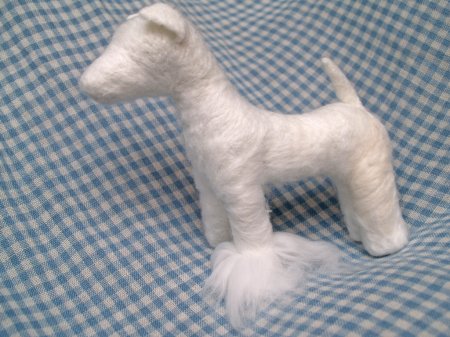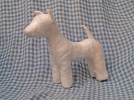 Итак, обваливаем проволочный каркас шерстью-основой, затем наносим шерсть, передающую окрас собаки.
