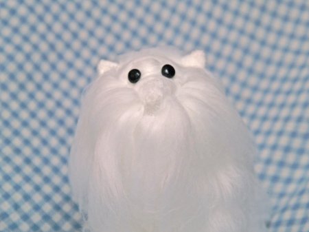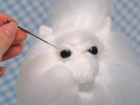 Точно таким же материалом формируются глаза, а лоб должен остаться белым. Нос устанавливается на свое законное место при помощи прозрачного клея. Для бровей подойдет шерсть коричневого размера. Не стоит забывать про зрачки у глаз. Далее, чтобы завершить работу, нужно пройтись по всей поверхности изделия иголкой, чтобы устранить волоски и дефекты. При необходимости? слишком длинные и ненужные волоски срезаются при помощи ножниц.
