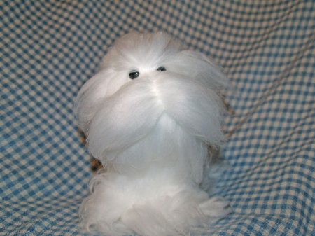 Небольшим количеством шерсти намечаем окраску собаки. Затем приваливаем длинные пряди и подстригаем. Любуемся нашей собачкой =)