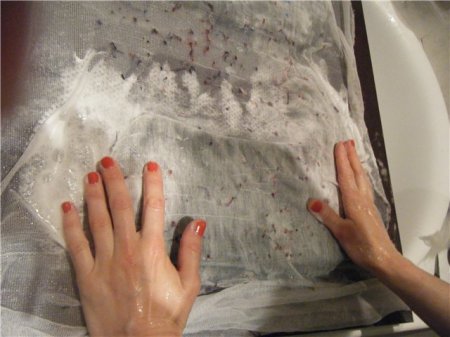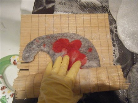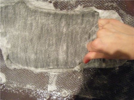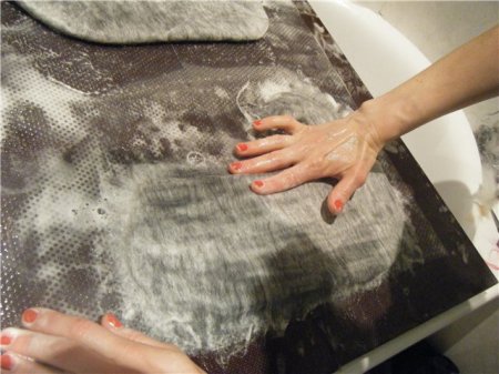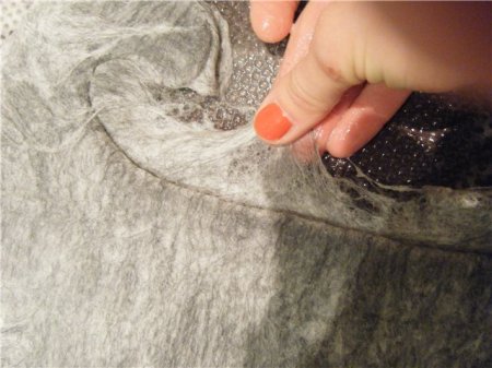- Приготовить мыльный раствор. Заготовку шерсти накрыть сеткой, увлажнить поверхность подготовленной жидкостью, снять накидку. Легкими круговыми движениями разглаживать изделие. Когда одна сторона сваляется, перевернуть заготовку и то же самое повторить с другой.