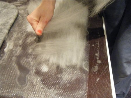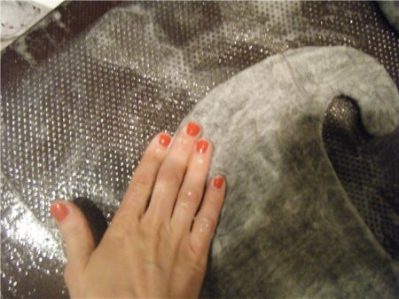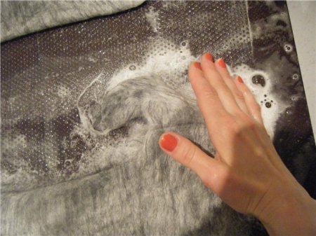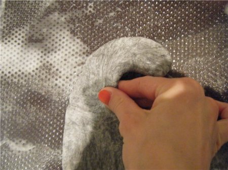 - Убрав воздушно-пузырьковую пленку, продолжать действия. Делать это нужно до тех пор, пока шерсть не станет отходить от клеенчатых лекал, находящихся внутри заготовки.