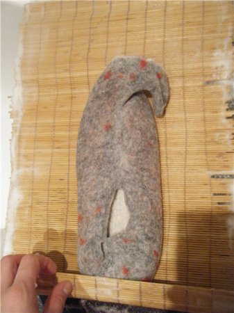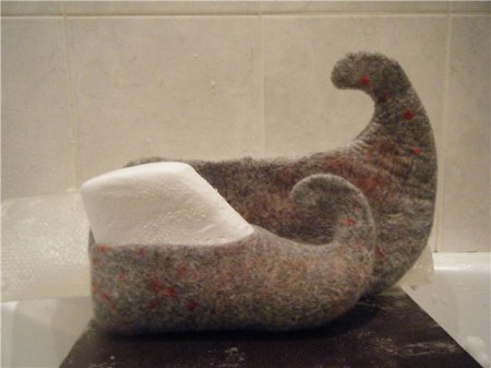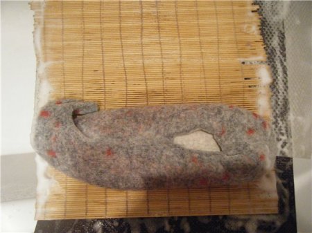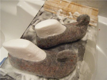 - Теперь пленка удаляется и формируется тапочек, после чего изделие нужно валять еще около часа, а затем промыть под проточной водичкой.
