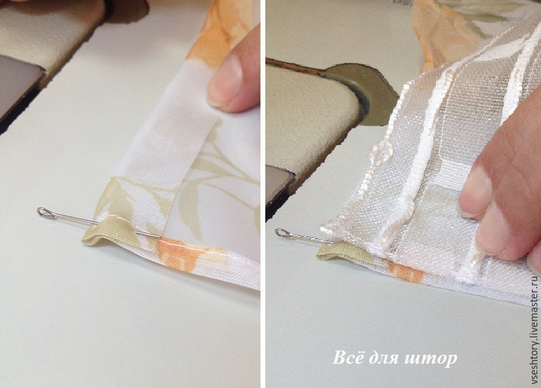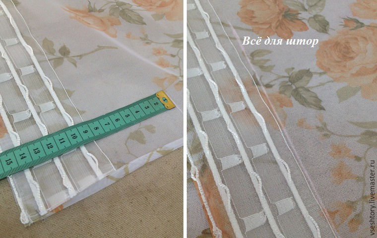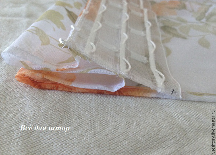 Совмещаем верхний край шторы и тесьму, подогнув под тесьму 1,5 см ткани.