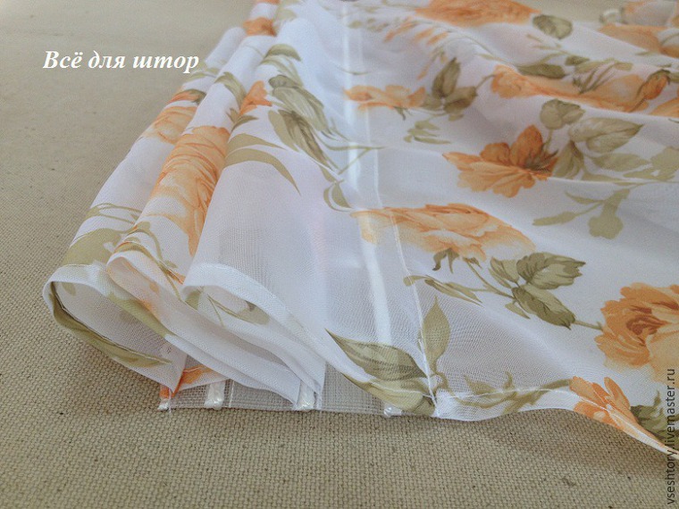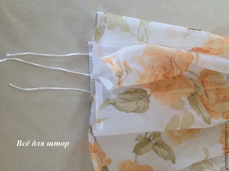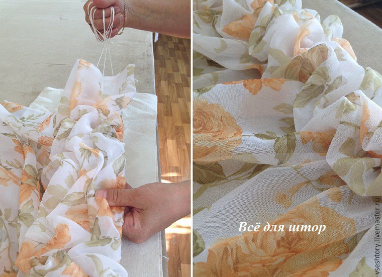 Складки на ткани получаются за счет применения специальной шторной ленты, пришитой к полотну, а затем правильно стянутой.