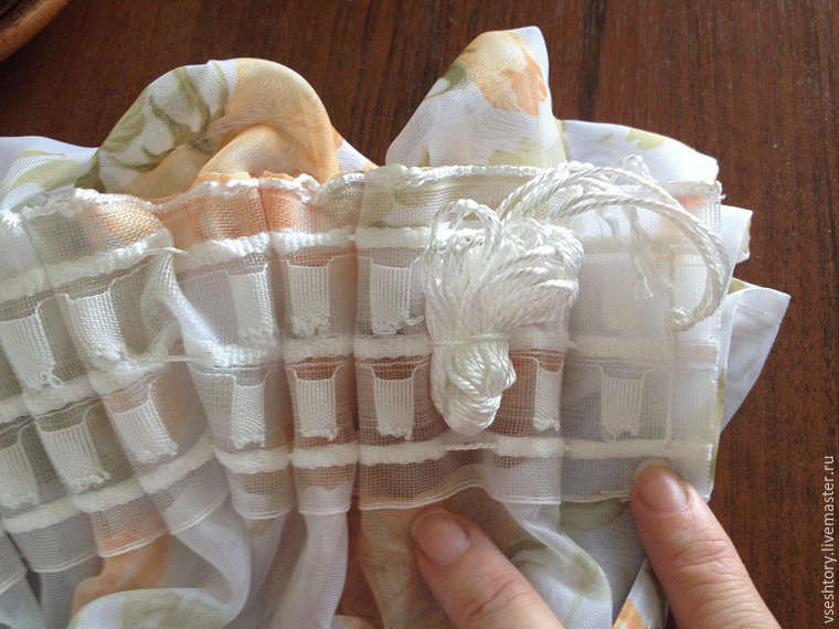Осталось навести красоту. Вытягиваем со свободного, не прошитого конца тесьмы нити-корды и стягиваем ткань до нужной ширины (длины карниза).